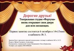 Театральная студия «Фортуна» вновь открывает свои двери для всех желающих. Первое занятие состоится 6 октября в 14 ч 15 мин в кабинете №3. Педагог Ярова Е.А. Телефон для справок 89816908260.